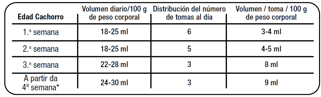 El número de tomas al día y la cantidad diaria de leche maternizada varían en función de la edad y del peso de cada cachorro* Tabla orientativa del volumen de leche necesario para un buen desarrollo del cachorro: