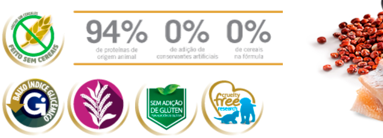 Composición: Carne de pescado (mín. 20%), harina de pescado, quinoa (mín. 8%), almidón de papa, aceite de pollo, aceite de pescado, psyllium, linaza, levadura de cerveza, coco deshidratado (mín. 0,15%), extracto de cúrcuma (mín. 0,15%), extracto de té verde, extracto de aloe vera, betacaroteno, luteína, fruto-oligossacarídeos, mannan-oligossacarídeos, DL-metionina, taurina, L-carnitina, sulfato de condroitina, sulfato de glucosamina, zeolita, hidrolisado de hígado de pollo y/o cerdo, vitaminas (A, D3, E, K3, B1, B2, B6, B12, C, biotina, niacina, ácido pantotênico, ácido fólico, cloreto de colina), cloruro de potasio, carbonato de cálcio, fosfato bicálcico, ácido fosfórico, fierro orgánico, cobre orgánico, zinc orgánico, manganeso orgánico, selenio orgánico, iodato de calcio, propionato de calcio, antioxidante natural (concentrado de tocoferoles).
